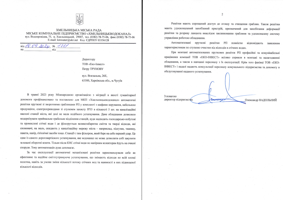 Po niemal dwóch latach intensywnej eksploatacji naszych urządzeń na miejskich przepompowniach, władze oczyszczalni ścieków w Chmielnickim podzieliły się z nami swoją opinią. Z dumą możemy poinformować, że nasze kraty prętowe RP w pełni spełniają ich oczekiwania, a poniższa opinia stanowi potwierdzenie skuteczności zastosowanego rozwiązania.